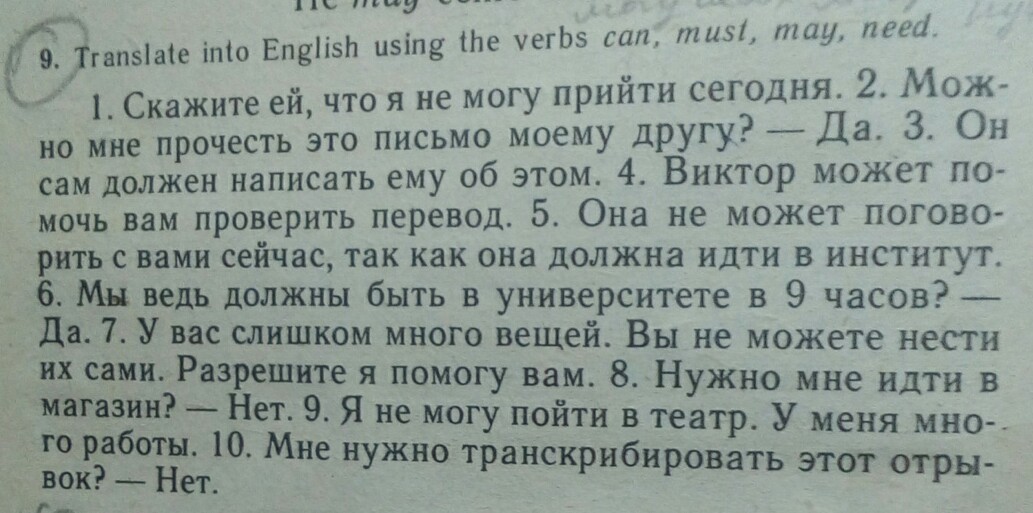 Tell her, that I can't come today. May I read this letter to my friend? Yes. He must write him about this. Victor can help you check the translation. She can't talk with you right now, because she must go to the university. We need to be in the university at 9 o'clock? Yes. You have too much clothes. You can't carry it by your own. Let me help you. Do I need to go to the store? No. I can't go to the theater. I have a lot of work. Do I need to transcribe this fragment? No.