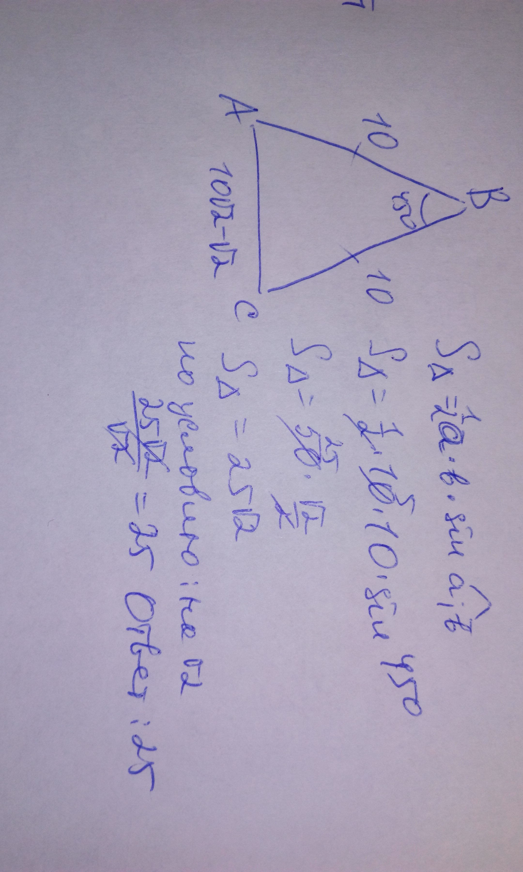 В равнобедренном треугольнике боковая сторона равна 10, основание 10√2-√2, а угол, лежащий против основания равен 45°. Найдите площадь треугольника, делённую на √2.