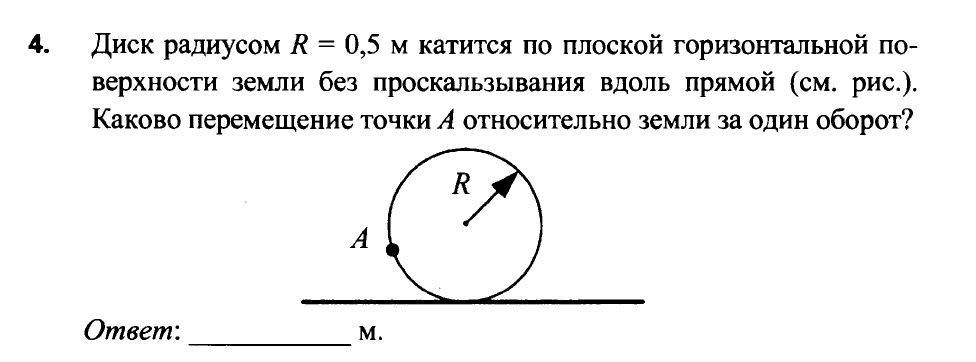 Диск радиусом R=0,5 м катится по плоской горизонтальной поверхности земли без проскальзывания вдоль прямой. Каково перемещение точки А относительно земли за один оборот?