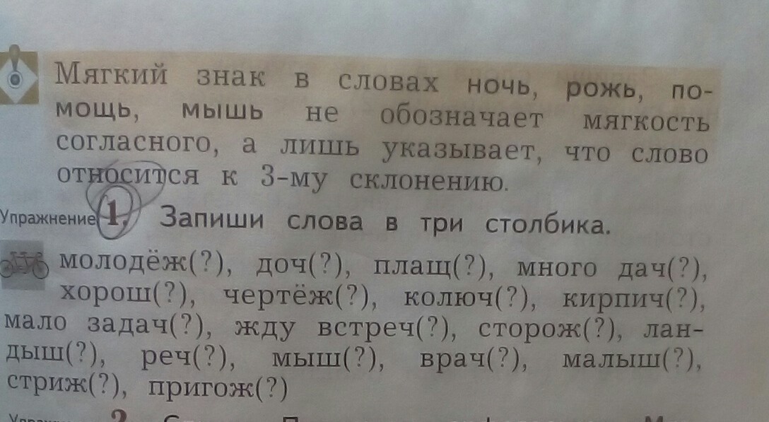 2. Плащ, хорош чертёж, колюч, кирпич, сторож, ландыш, врач, малыш, стриж, пригож. Все слова мужского рода (плюс ко всему, слова "хорош, "пригож" и "колюч" краткие - а в кратких прилагательных не ставится на конце "ь" после шипящей) , поэтому не ставиться "ь" после шипящей.