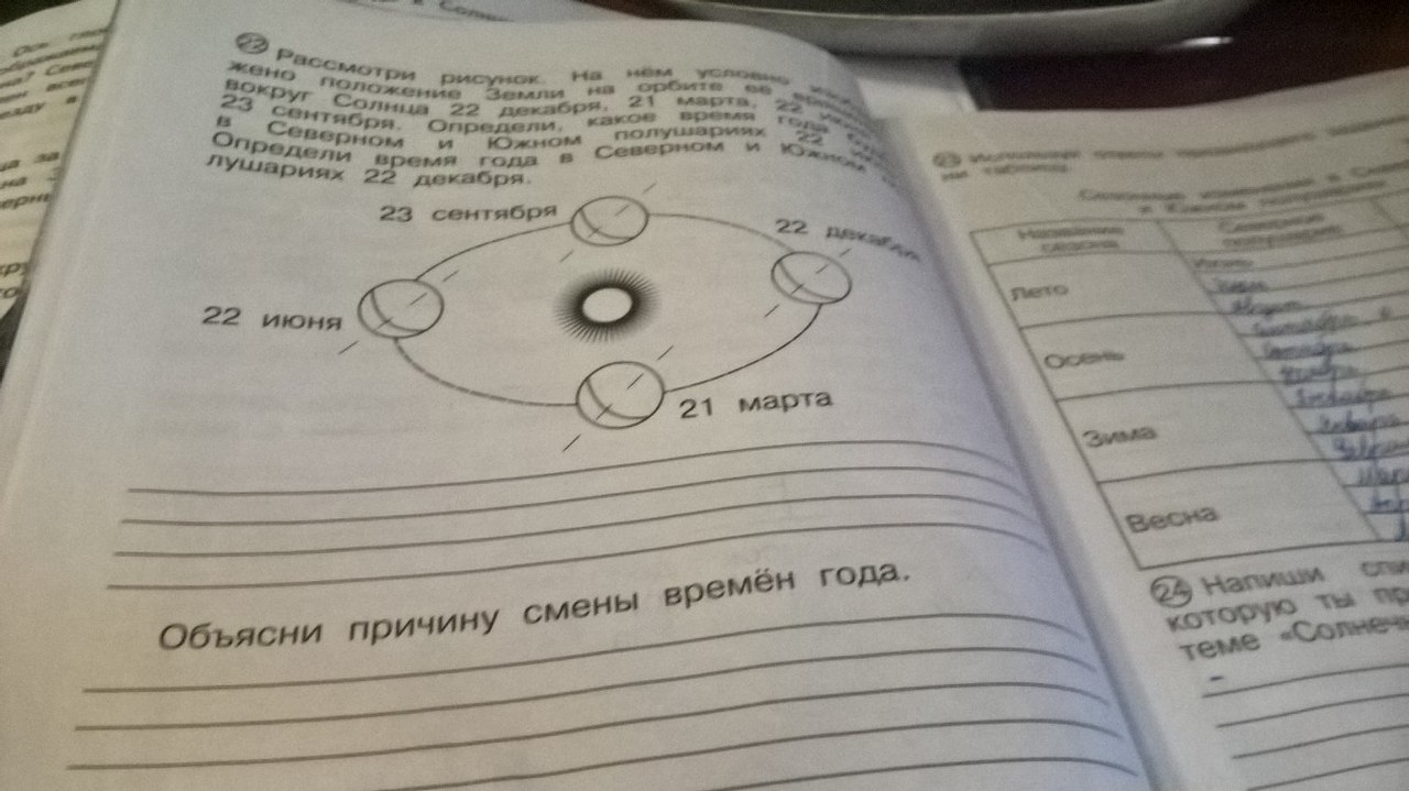 На южном зима .Смена происходит потому-что Земля вращается вокруг солнца .