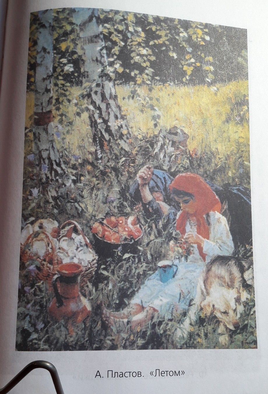 А. Пластов нарисовал картину "Летом", которое просто дух захватывает. В этом картине нарисованы мама, дочка и собака. Видем что они собрали яблоки и грибы, они устали и отдыхают. Девочка одета в беленьком плате и красный плоток она села и у нее в руке веточка и на колени поставила кружку с чаем, а мама одета в синем плате и синем плотке она уснула рядом с дочкой, и собаке их не тоже лежит с девочкой. У собаке три цвета это белое, коричневый и черный. Вокруг них березки желтыми листьями, это значит что осень наступил.