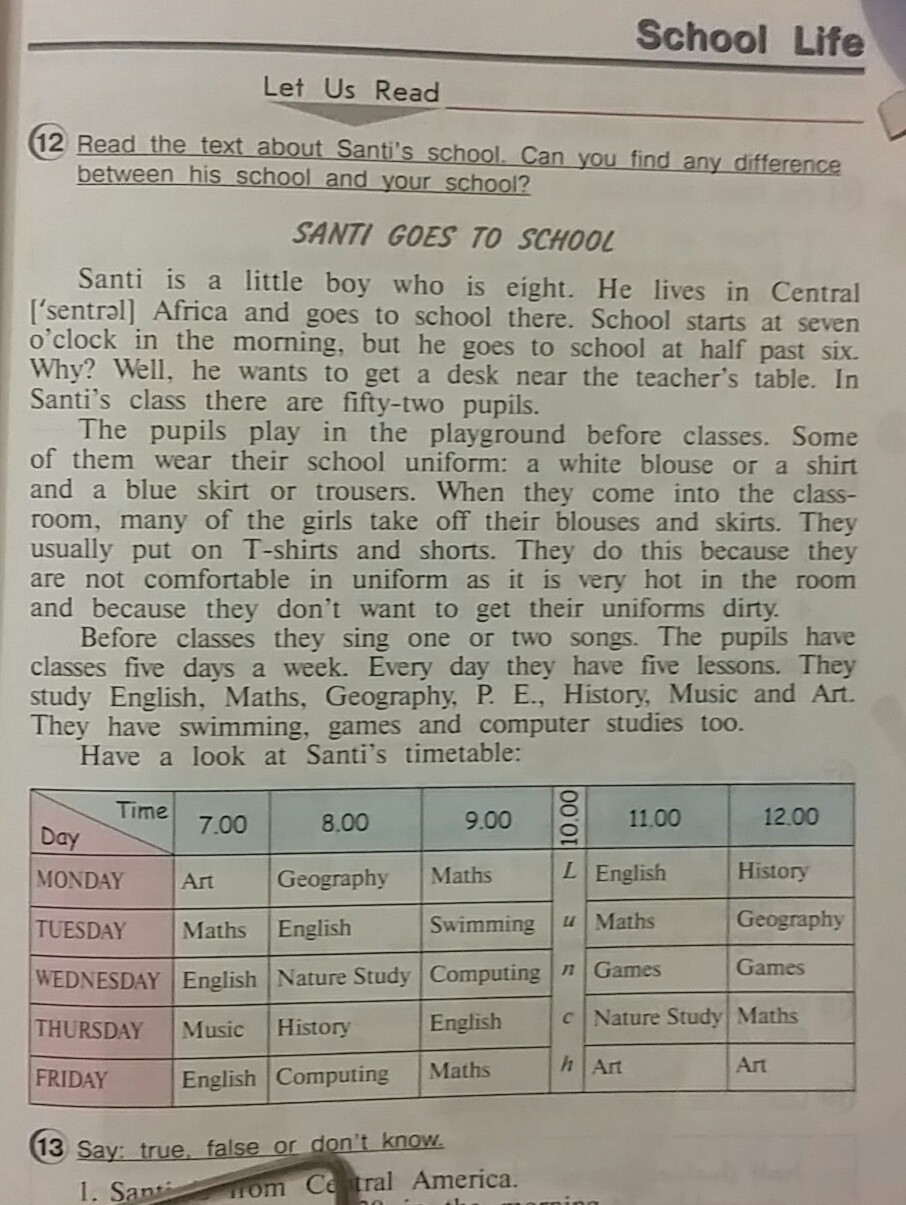 Read the text adout Santi's school. Can you find any difference between his school and your school?