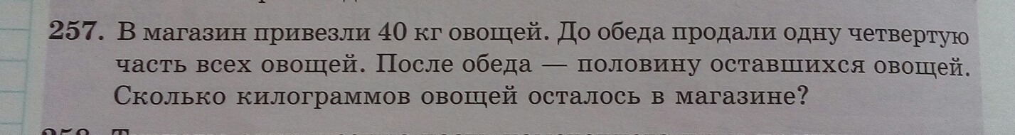 (40-10):2=15(кг) — продали после обеда.