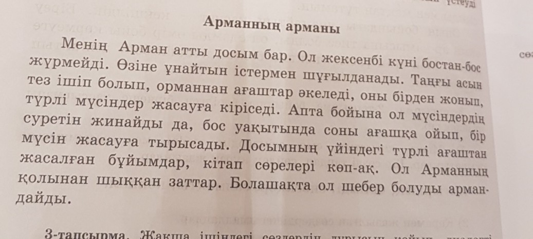 У меня есть друг Арман. По воскресеньям он не сидит сложив руки. Делает то что ему нравится. Быстро позавтракает и идет в лес собирать разные палки .