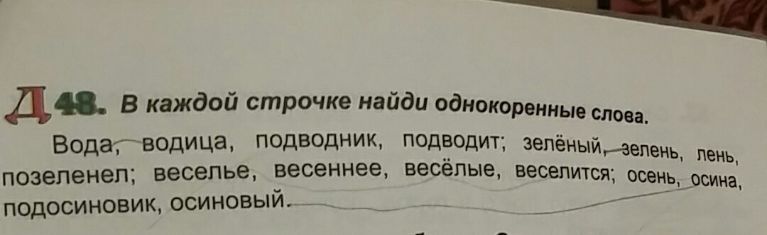вода-водица-подводник; зелёный,зелень,позеленел; весёлые,веселье,веселится; осина, подосиновик,осиновый