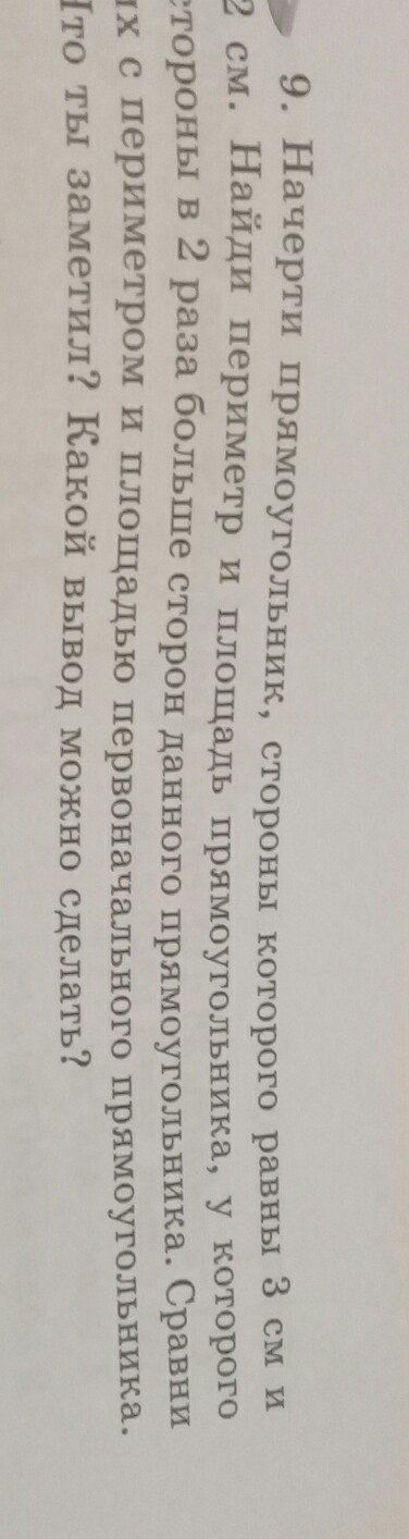 начерти прямоугольник стороны которого равны 3 сантиметров и 2 сантиметров Найди периметр и площадь прямоугольника у которого стороны в два раза больше стороны данного прямоугольника сравнить их с периметром и площадью первоначального прямоугольника что ты заметил Какой вывод можно сделать