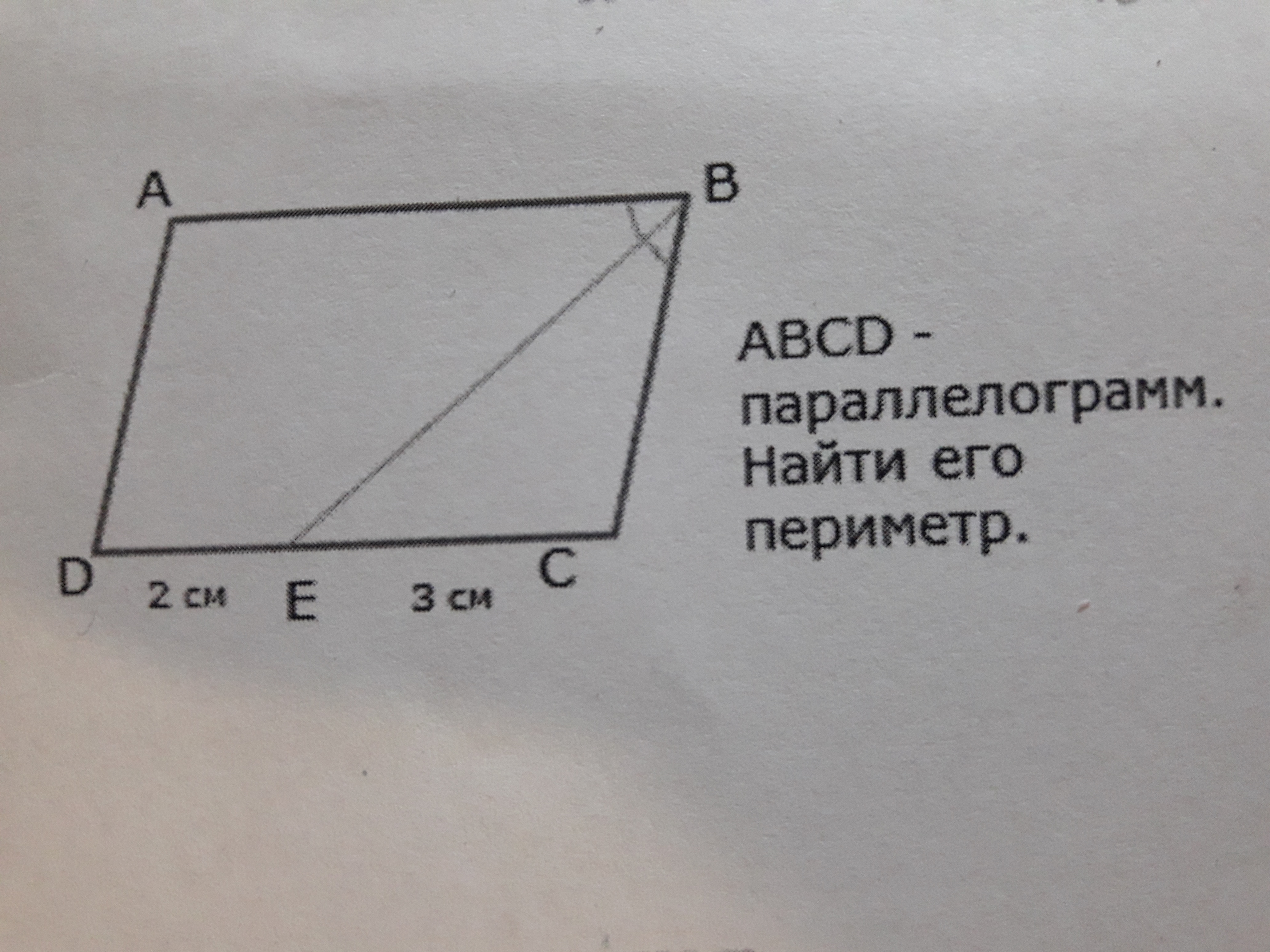 Вообще по свойству сумма всех сторон параллелограмма равна 360 градусам. Е получается биссектриса. Получается равнобедренный треугольник ЕСВ. у этого треугольника 2 стороны равны т.е 6 см. Одна сторона 2+3=5. 5+5=10 это 2 стороны. 6+6=12 это 2 стороны. Значит 12+10=22 см.