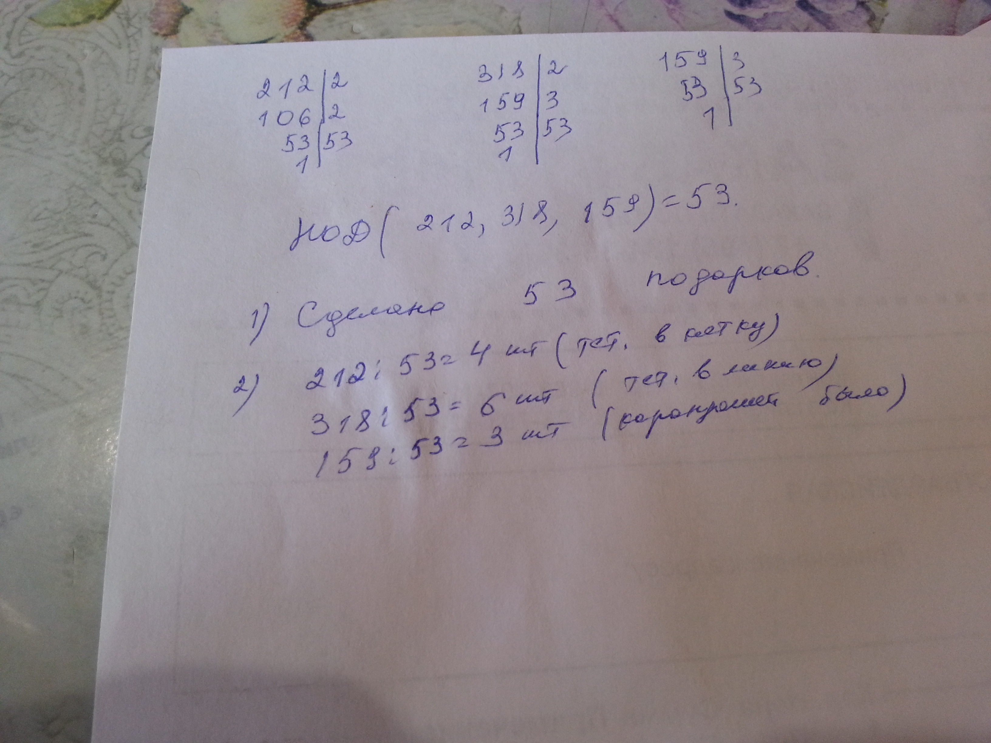 Для подарка первоклассникам в папку положили тетради в клетку, тетради в линию и карандаши. Всего закуплено 212 тетрадей в клетку, 318 тетрадей в линию и 159 карандашей. 1) сколько сделано подарков? 2) сколько тетрадей в клетку, тетрадей в линию и карандашей было в каждой папке?