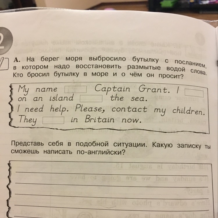 My name is Capitan Grant. I am on an island in the sea. I need help. Please, contact my children. They are in Brtain now.