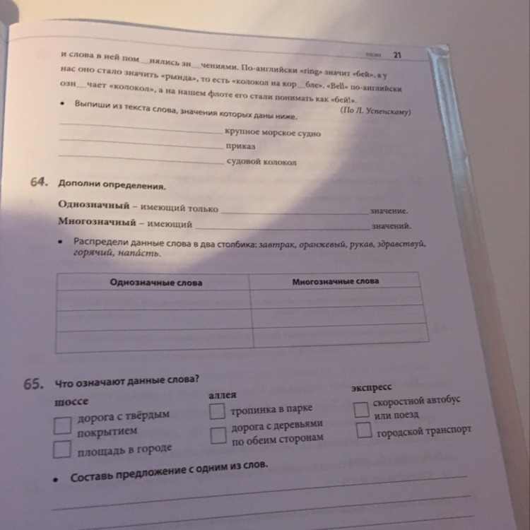 №64-Боюсь скажу не правильно. Лучше дам ответ №65: шоссе-дорога с твёрдым покрытием; аллея-дорога с деревьями по обеим сторонам; экспресс-скоростной автобус или поезд. Предложение: Мы прошли через аллею и вышли на главную улицу.