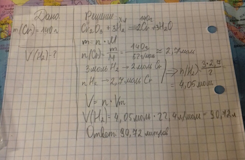 Сколько грамм оксида хрома(3) требуется для получения 140 грамм хрома? Какой объем водорода потребуется для восстановления?