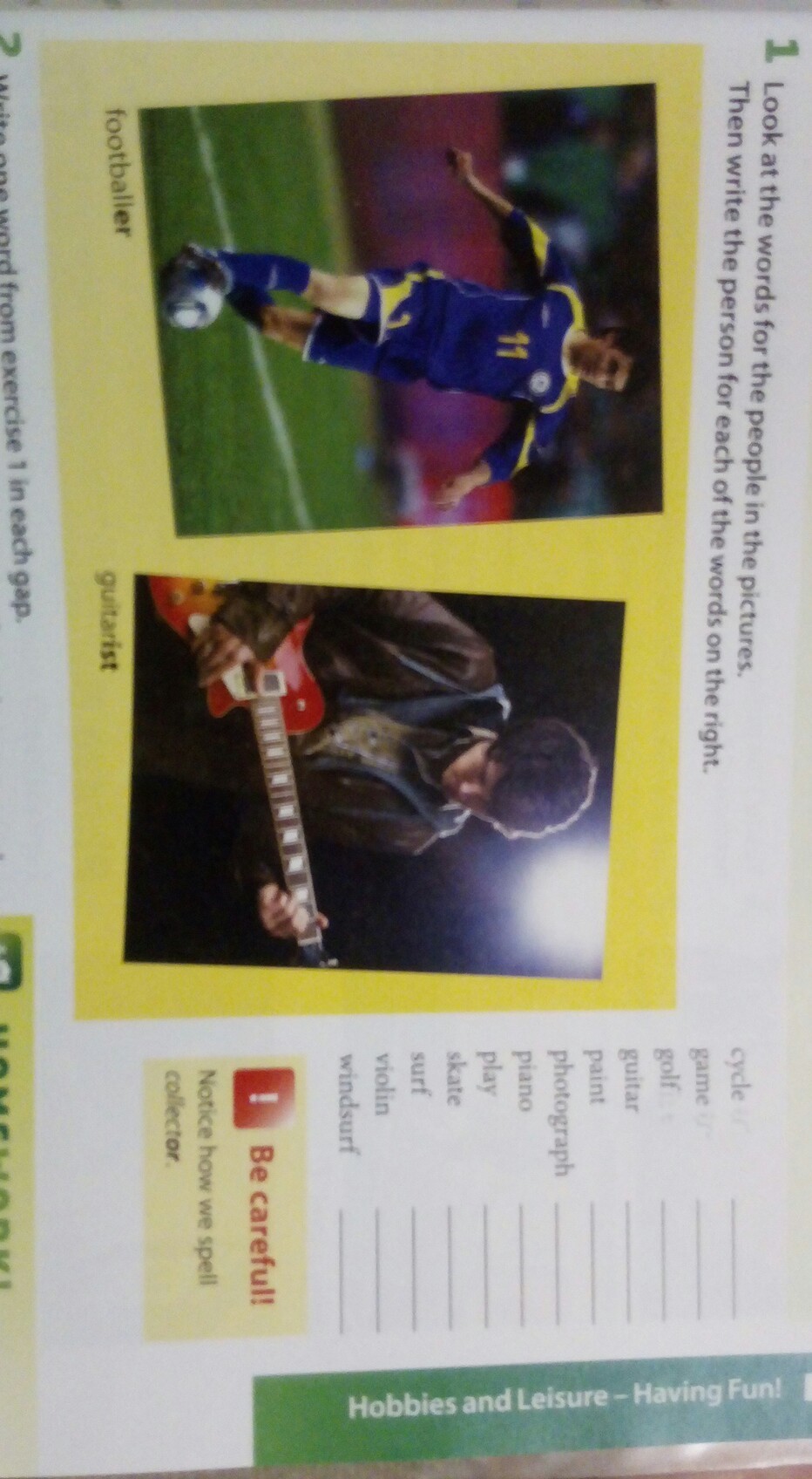 Нужно слова из столбика соотнести к каждому на фотографии. Перевод слов: цикл , игра , гольф , гитара , краски , фотография, фортепиано, играть, кататься на коньках , серфинг, скрипка , виндсерфинг. Примерно так.