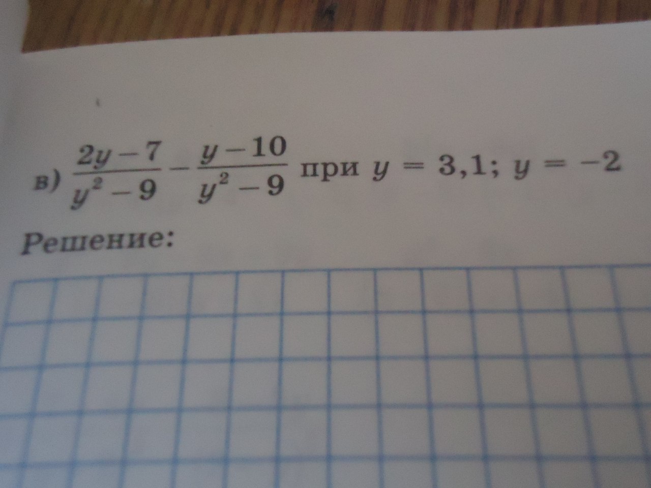 3) 2у-7-у+10у2-9= у+3(y-3)(y+3) = 1y-3 при у =3.1 13.1-3=1 .1=10 при у =-2 1-2-3=1-5=-0.2