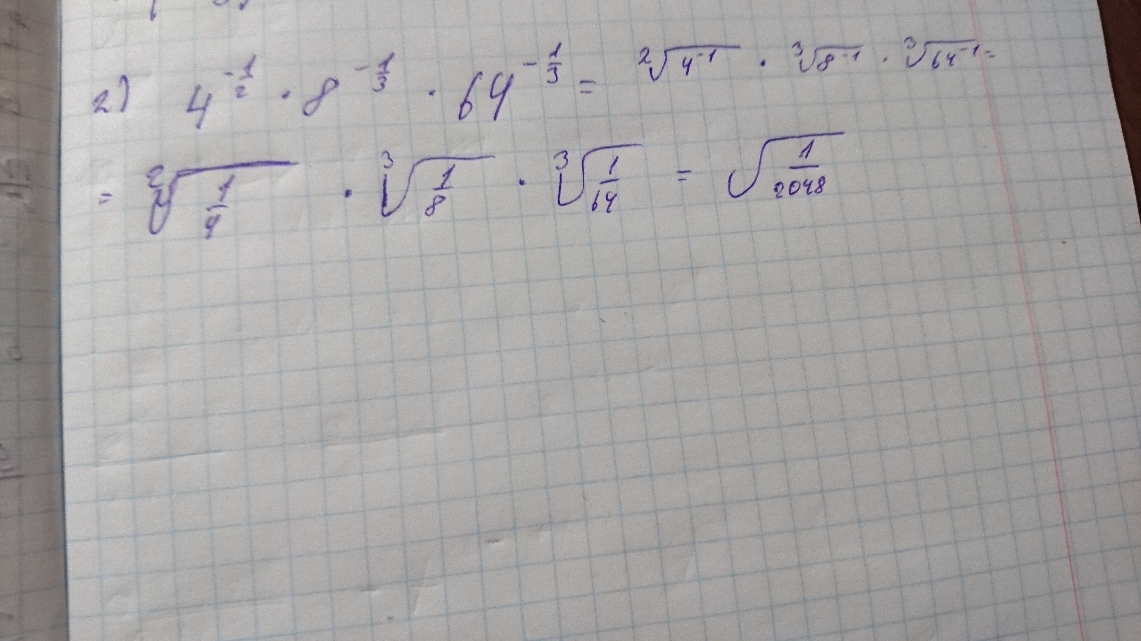 2) 2⁻²⁽¹/²⁾* 2³*⁽⁻¹/³⁾+4³⁽¹/³⁾ = 2⁻¹*2⁻¹*4= 4⁻¹*4 = 1