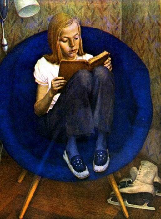Ее глаза увлеченно бегают по строкам. Видно, как сильно девочке нравится читать. Ее взгляд сосредоточен. Мила не замечает ничего, что происходит вокруг. Она полностью погружена в мир книги. Интересной деталью являются коньки, которые лежат под креслом. Это дает нам понять, что Мила - личность увлекающаяся и интересная. Картина очень живая и яркая.