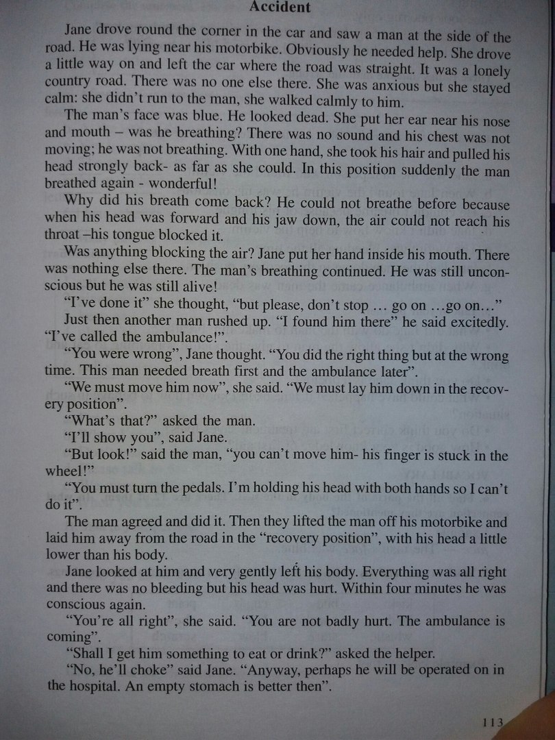 Л 26% 853 PMAccidentJane повернул за угол в машину и увидел человека на обочине дороги. Он лежал рядом со своим мотоциклом. Очевидно, ему нужна была помощь. Она дровея немного дальше и вышла из машины, где была прямая дорога. Это была гола lonelycountry. Больше никого не было. Ей было тревожно, но она stayedcalm: она не бежала к мужчине, она спокойно подошла к нему.Лицо мужчины было голубым. Он выглядел мертвым. Она положила ее ухо возле его nosand рот - он дышит? Не было звука и грудь его не тронула: он не дышал. С одной стороны, она взяла его за волосы и потянул голову сильно назад - насколько она могла. В таком положении вдруг вновь родилась челюсть-замечательно!Почему его дыхание вернулось? Он не мог дышать до того, как его голова была вперед и его челюсть опустилась, воздух не мог дотянуться до его горла-его язык заблокировал его.Что-нибудь блокировало воздух? Джейн положила руку ему в рот. Там больше ничего нет. Человек дышит продолжил. Он все еще был без сознания, но он был еще жив!*Типо сделал это* - подумала она. но, пожалуйста, не останавливайся - продолжай - продолжай.Просто какой-то человек бросился. - Я нашел его там, он взволнованно сказал.*т уже вызвал "скорую"!*Вы ошиблись Джейн думала. Ты поступила правильно, но не в то время. Этот человек нужен первый вдох и laterWe скорой помощи должны переместить его сейчас, - сказала она. Мы должны положить его в положение восстановления, что это? Спросил у manTTL показать, что ты сказала Джейн * Но посмотри! Говорит мужчина, ты не можешь его двигать - палец застрял в колесе**ты должен повернуть педали. Я держу его голову обеими руками, так что не может человек согласился и сделал это. Затем они подняли человека его мотоцикл anddlaid его от дороги в восстановительном положении, с головой чуть-чуть больше, чем его bodyJane посмотрел на него и очень аккуратно покинул его тело. Все было хорошо, кровотечения не было, но голова болела. В течение четырех минут он снова WasCONSCIOUS*с тобой все в порядке, - сказала она. *Вы не сильно пострадали. Скорая хочет, чтобы я принес ему что-нибудь поесть или выпить? Спросил помощника * нет, он тебя душит, сказала Джейн. В любом случае. Возможно, он будет оперироваться в больнице.
