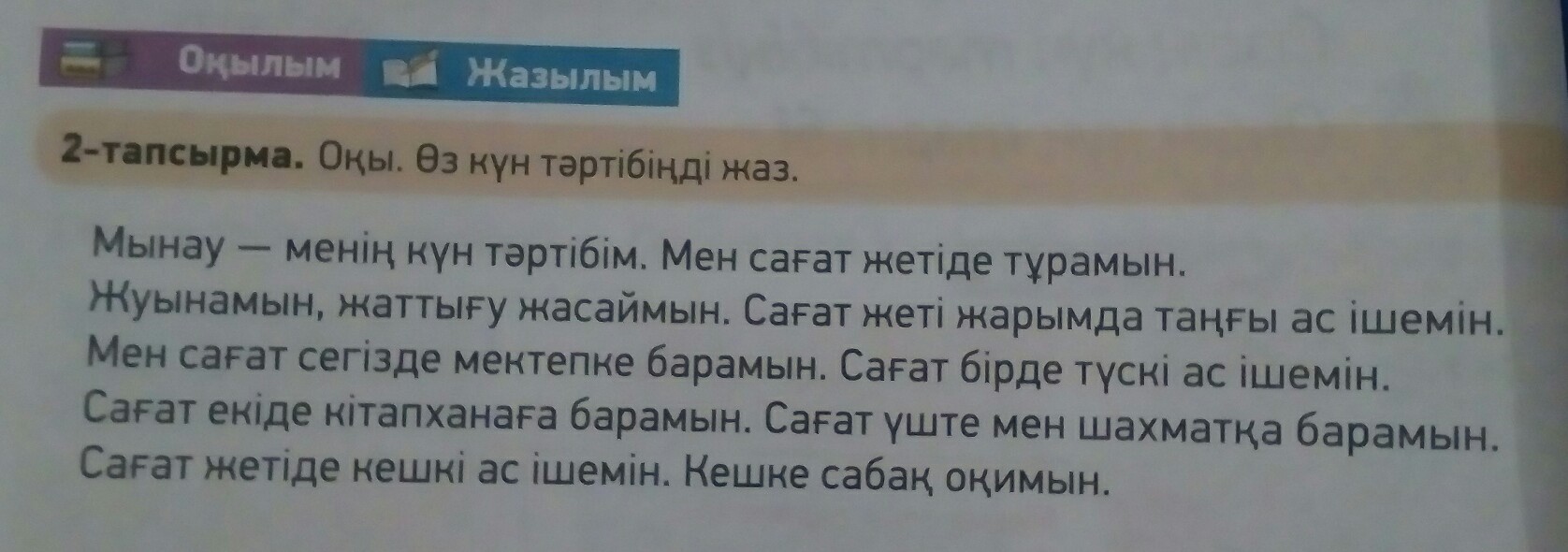 Сағат 1жарымда мектеп қайтамын. Сосын түскі асымды ішіп, достарыммен бірге серуенге шығамын. Сағат кешкі алтыда уй тапсырмаларын орындап, отбасымызбен бірге кешкі ас ішеміз. Саған 10да ұйқыға жатамын.