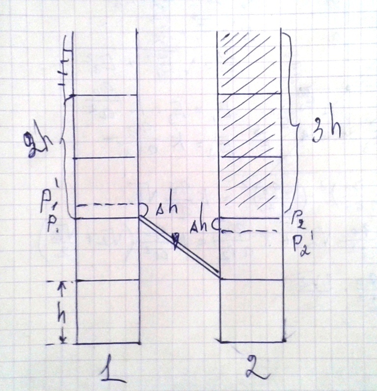 Два открытых сверху цилиндрических сосуда соединены наискось тонкой трубкой с краном как показано на рисунке. В сосудах находится жидкость плотностью ρ, налитая до высот 4h и 2h соответственно. В правый сосуд добавили 3h жидкости с плотностью 0,8ρ . На сколько сместится уровень жидкости с плотностью ρ в левом сосуде после того как кран откроют? Жидкости не смешиваются, объёмом соединительной трубки можно пренебречь. h=8 см. Пожалуйста можно с понятным объяснением.