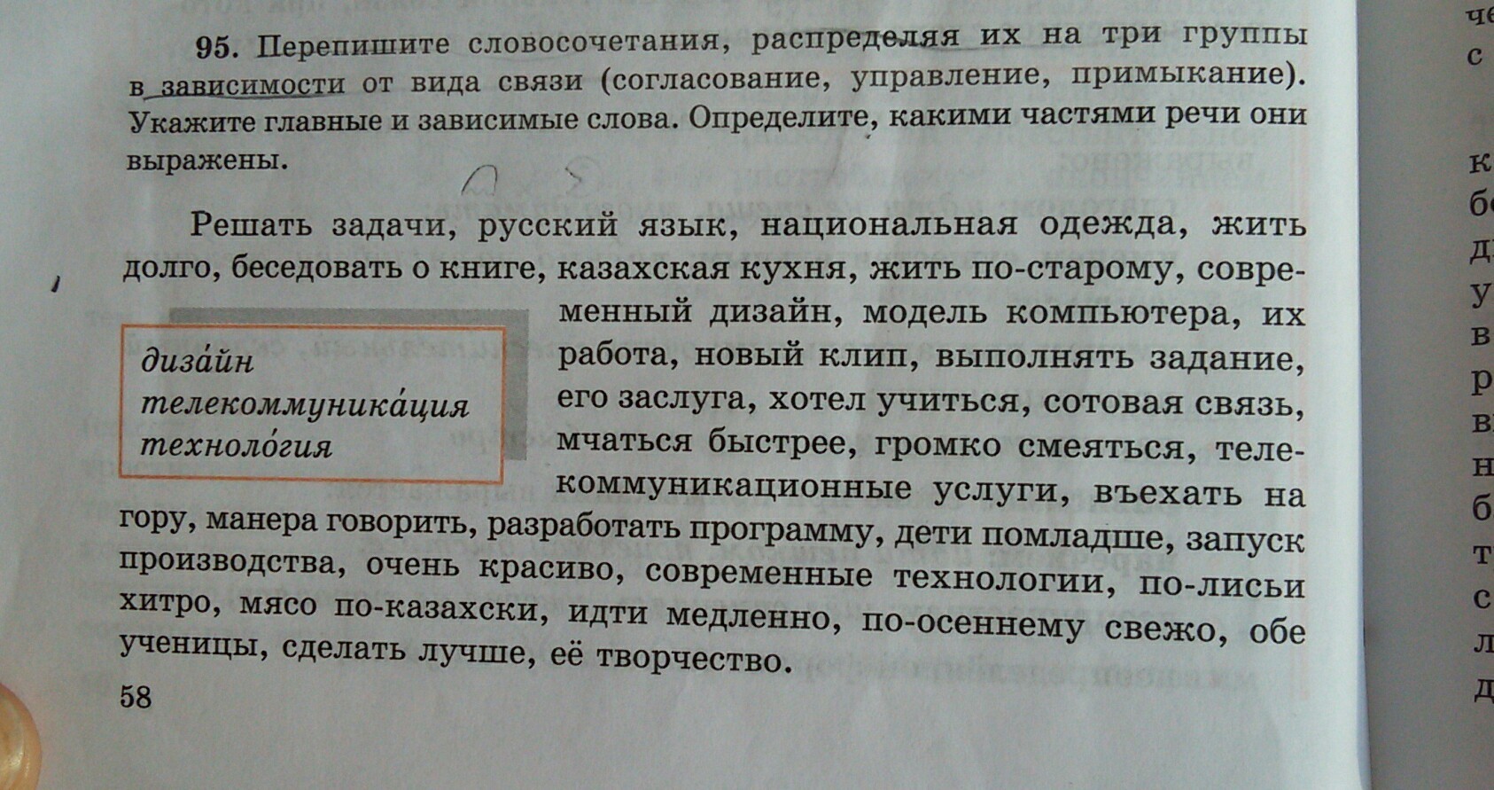 1)Согласование:Русский(зависим.прилагат) язык(главн,сущ), национальная(зависим.прилагат)одежда(главн,сущ),казахская(зависим.прилагат) кухня(главн,сущ),современный(зависим.прилагат) дизайн