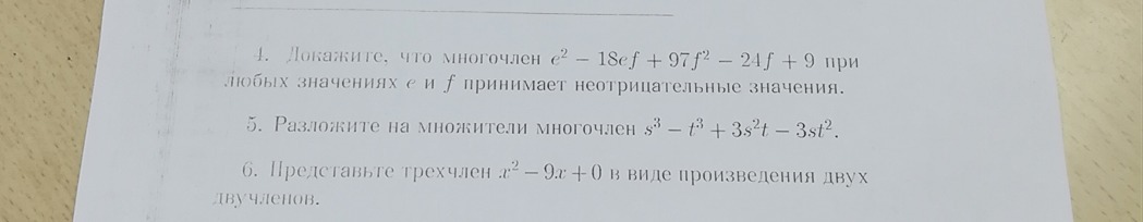 (e^2-18ef+81f^2)+(16f^2-24f+9)=(e-9f)^2+(4f-3)^2. выражения в скобках положительны при любых значениях переменных . следовательно и заданный многочлен принимает неотрицательные значения при любых значениях переменных.