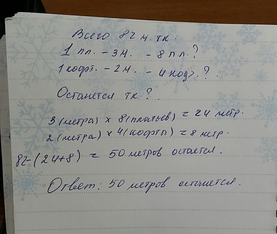 в куске 82 м. ткани.надо пошить 8 платьев и 4 кофточки. на платье расходуется 3м.ткани,на кофточки 2м ткани.сколько ткани останется после пошива?