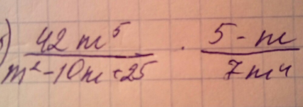 вообще после всех преобразований получается - (минус перед дробью) 6/5-m,так как m^5 и m^4 сокращаются и мотается только m,далее сокращаем 42 и 7 на семь, остаётся 6,далее m^2 -10m +25это есть формула сокращённого умножения,т.е. (m-5)^2 выносим минус за скобки и получаем -(5-m)^2 это сокращается на (5-m)