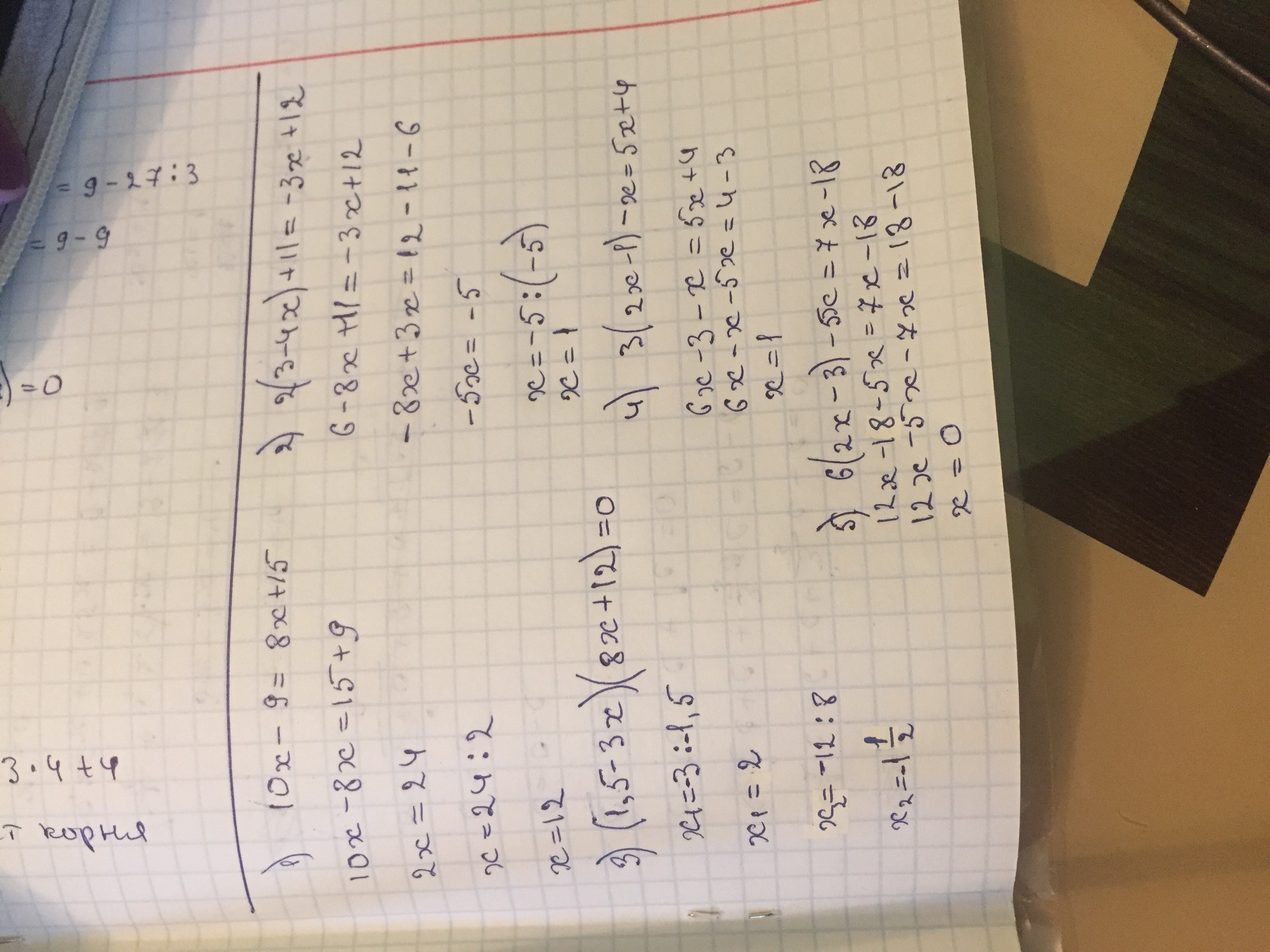 Решите уравнение: 1)10x-9=8x+15 б)2(3-4x)+11=-3x+12 в)(1,5-3x)(8x+12)=0 г)3(2x-1)-x=5x+4 д)6(2x-3)-5x=7x-18