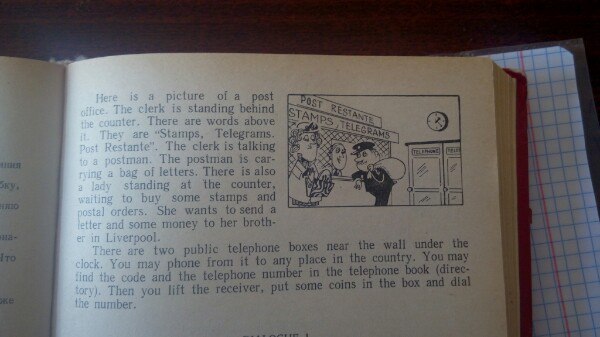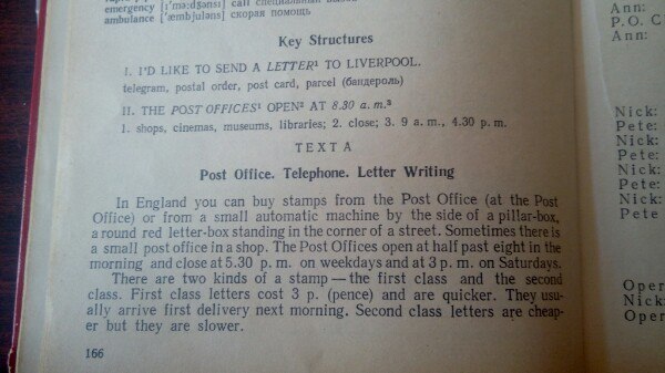В Англии вы можете купить почтовые ящики из офиса) от маленькой автоматической машины рядом с колонной-боком, круглым красным почтовым ящиком, стоящим в углу улицы. Иногда в магазине есть небольшое почтовое отделение. Почтовые отделения открываются в половине вечера восемь утра и закрываются в 5:30 с. м. в будние дни и на 3 п. м. по субботам. Существует два вида штампа: первый класс и второй класс. Письма первого класса стоят 3 p. (пенс) и быстрее. На следующее утро они приходят на первую поставку. Буквы второго класса дешевы, но они медленнее. это левый текст .