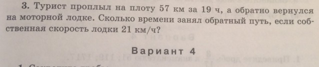 турист на лодке проплыл по реке 57 км за 19 ч, а обратно вернулся на моторной лодке. сколько времени занял обратный путь , если собственная скорость лодки 21 км/ч
