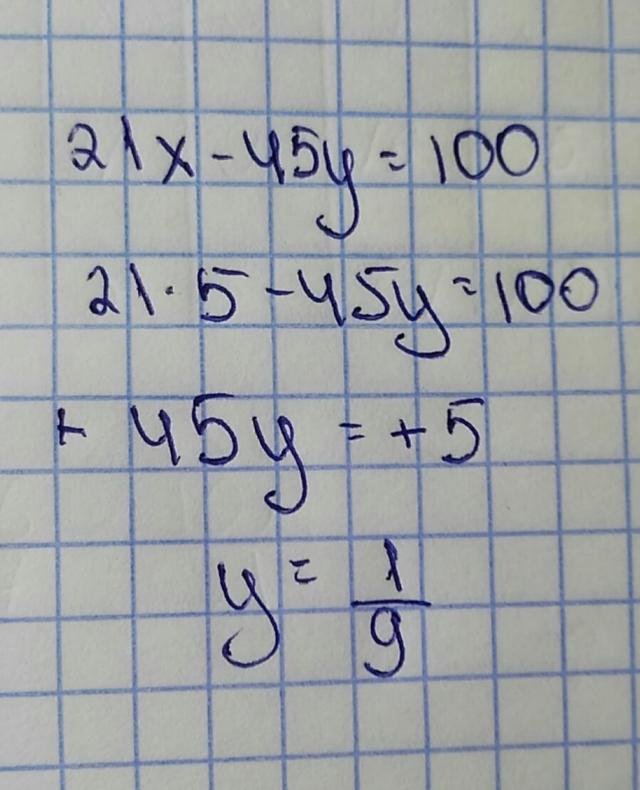 Известно, что решением уравнения 21x-45y=100 является пара чисел, где x=5. Найди соответствующее значение y.