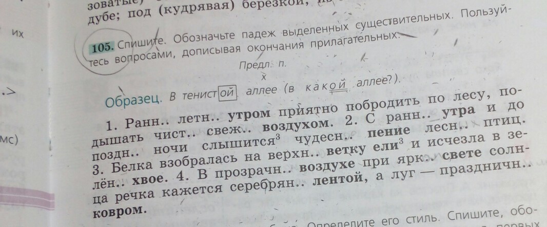 4. В прозрачном (в каком?) воздухе - П.п., при ярком (каком?) свете (П.п.), серебряной (какой?) лентой - Т.п., праздничным (каким?) ковром (Т.п.).