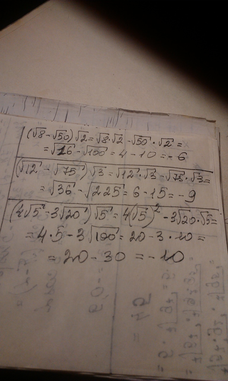 Срочно!!! Найдите значение выражений 1) (ѵ8 - ѵ50) * ѵ2 2) (ѵ12 -ѵ75) * ѵ3 3) (4 ѵ5 - 3 ѵ20) * ѵ5