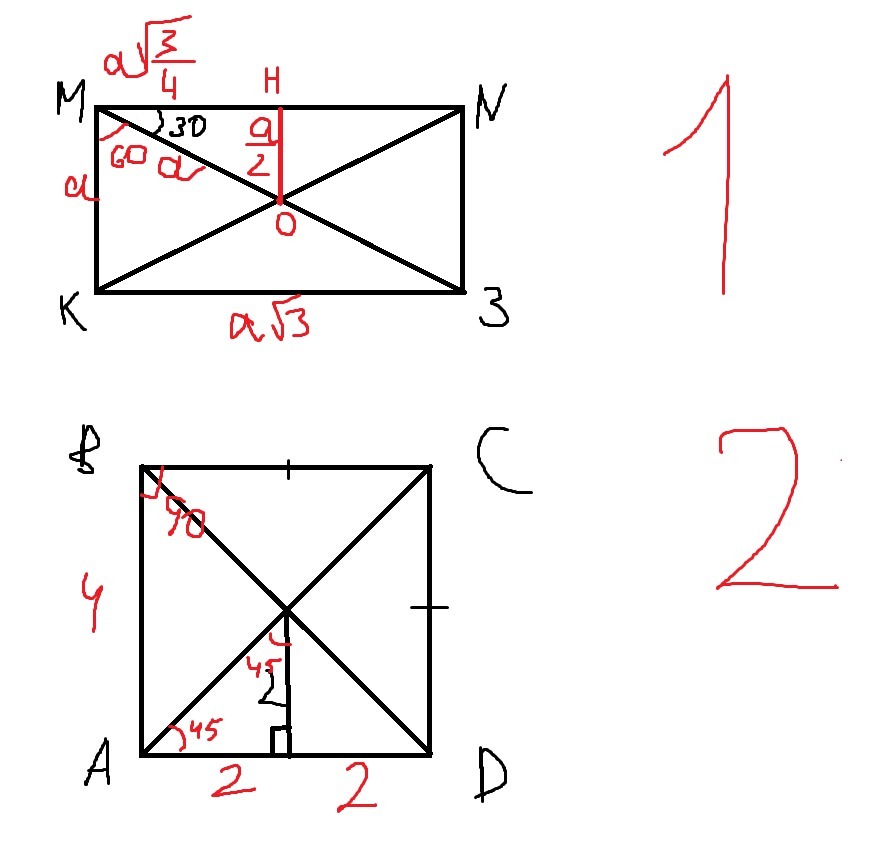 Получается прямоугольный треугольник MOH, в нем угол М = 30 градусов, а против угла 30 градусов лежит катет, равный половине гипотенузы (MO) - a/2, тогда MH по теореме пифагора = корень(a квадрат - а квадрат /4) = корень(3а квадрат /4 )=a*корень из 3/4, следовательно сторона HN равна такому же числу, а сторона MN = 2 * MH, тогда MN=а на корень из 3, сторона КЗ тоже равна MN.