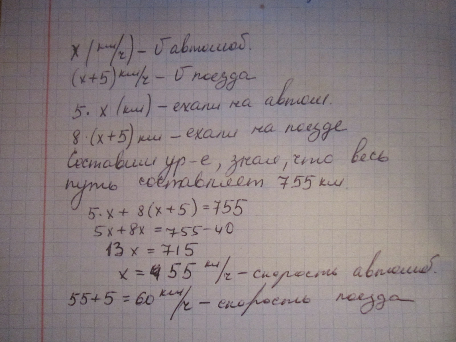 туристы 5ч ехали на автомобиле и 8ч на поезде. за это время они проделали путь в 755 км. какова скорость поезда, если она на 5 км/ч больше скорости автомобиля?