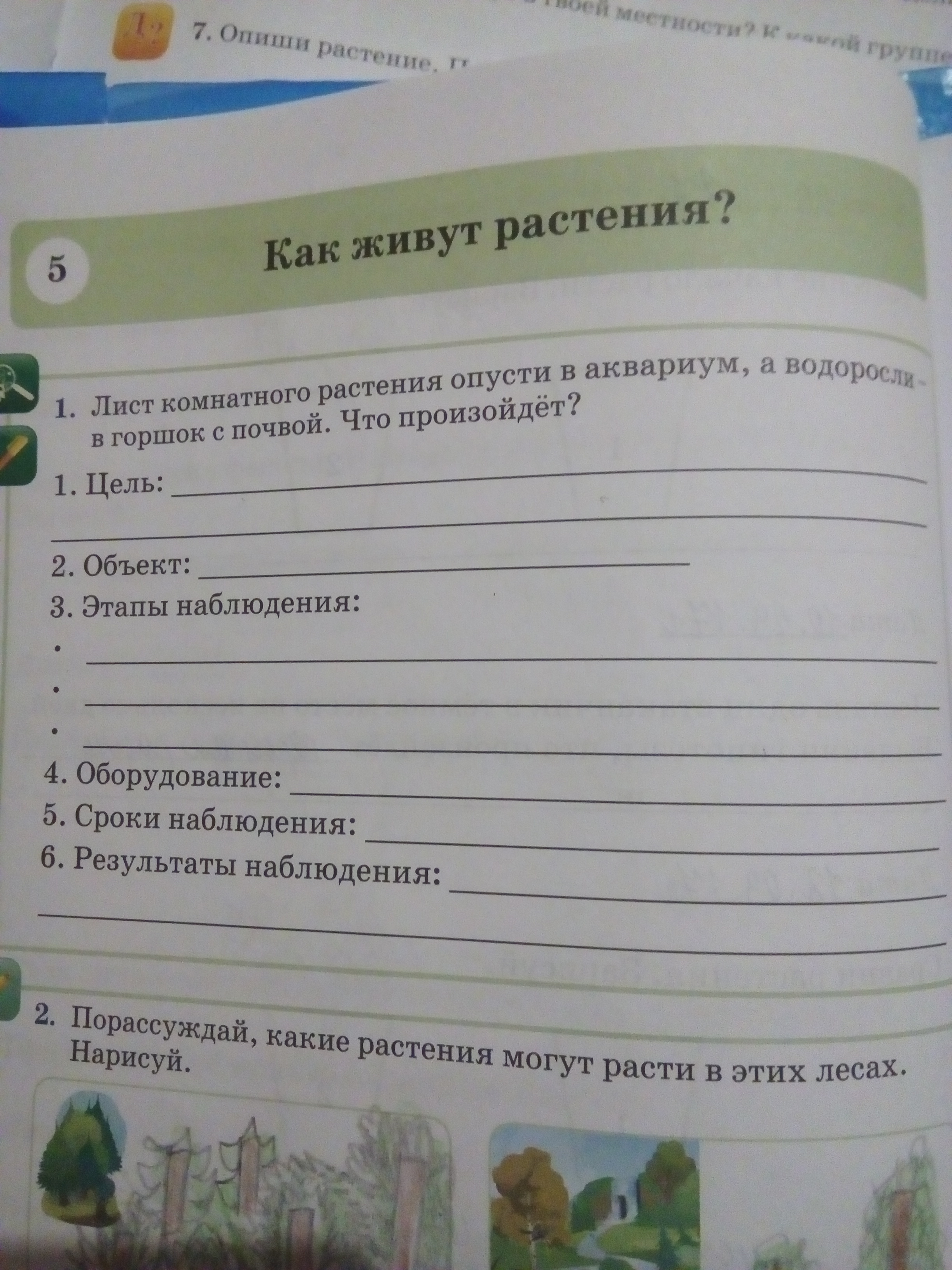 объект 1 листок в аквариуме; объект 2 водоросль в горшке
