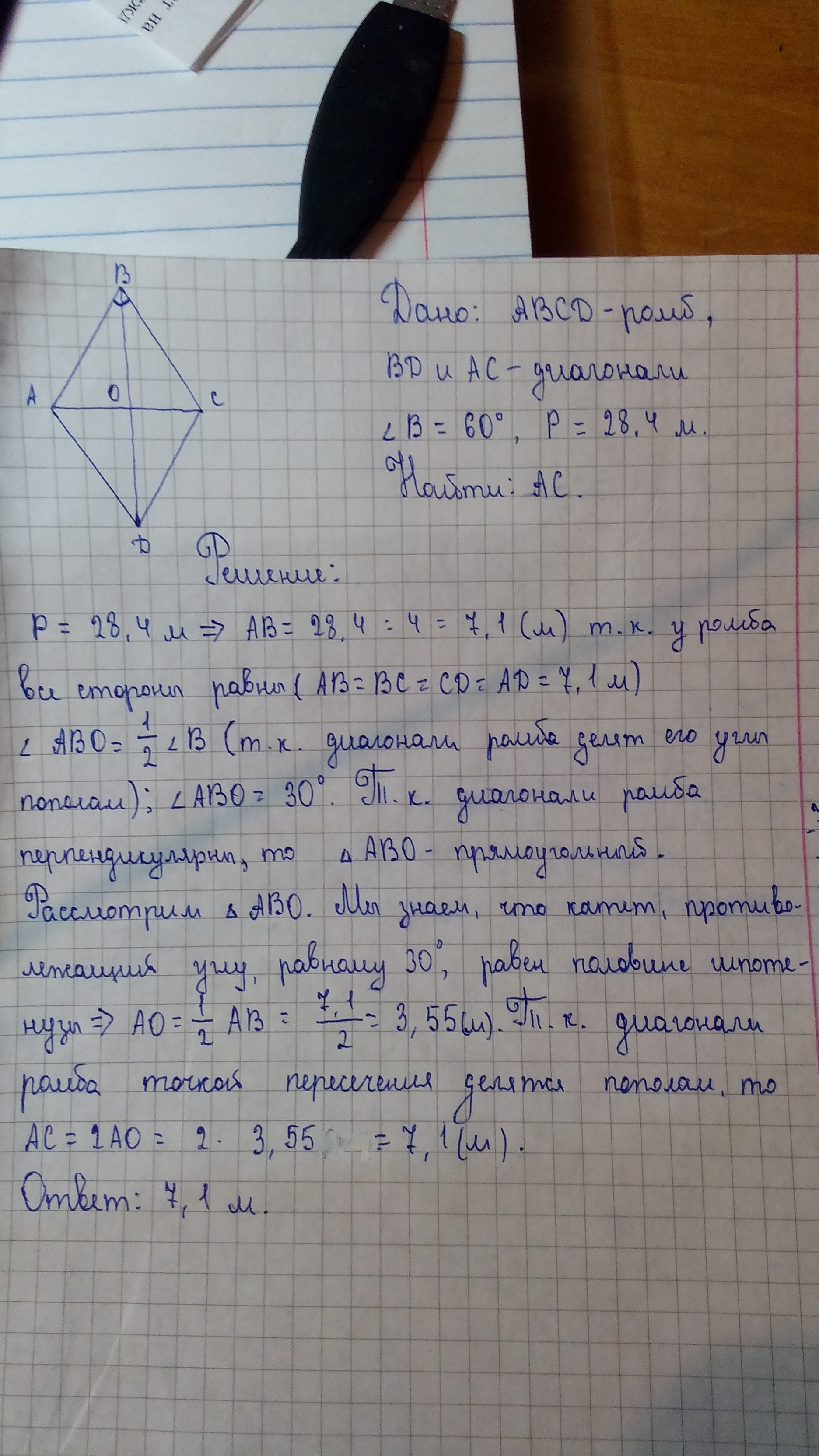 Острый угол ромба равен 60°, периметр равен 28,4 м. Вычисли меньшую диагональ ромба. помогите пожалуйста