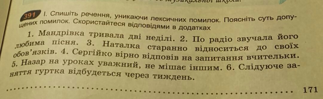 Мандрівка(подорож) тривала два тижні. По радіо звучала його улюблена пісня. Наталка відповідально відноситься до своїх обов'язків. Сергійко дав правильну відповідь на запитання вчительки. Назар на уроках уважний( серйозний, зосереджений) , не заважає іншим. Наступне заняття гуртка відбудеться через тиждень