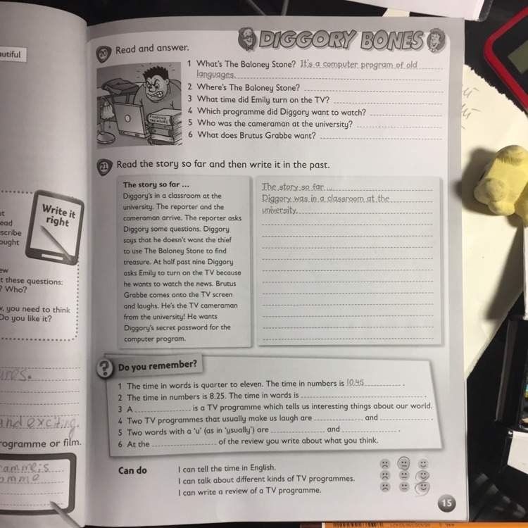 the reporter and the cameraman arrived. The reporter asked Diggory some quiestions Diggory said that he didn't want the thief to use The Baloney Stone to find treasure. At half past nine Diggory asked Emily to turn on the TV because he wanted to watch the news. Brutus Grobbe came onto the TV screen and laught. He was the TV cameraman from the university! He wanted Diggory's secret password for the computer programme.