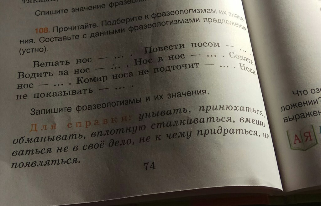 вешать нос ,повести носом,водить за нос,нос в нос,совать нос,комар носа не подточить, носа не показывать.Записать фразеологизмы и их значения.