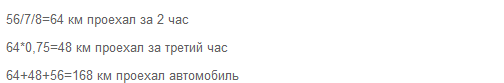 1)Автомобиль За Первый Час Проехал 56 км. , что составило 7/8 того пути, который он проехал за 2 час. За 3 третий час автомобиль проехал 0,75 пути, который он проехал за 2 день. сколько всего автомобиль проехал километров за 3 часа? 2)в магазине в первый день продали 35%, во второй день 28% всех овощей, а в третий день оставшиеся 333 кг. сколько килограммов овощей было в магазине первоначально?