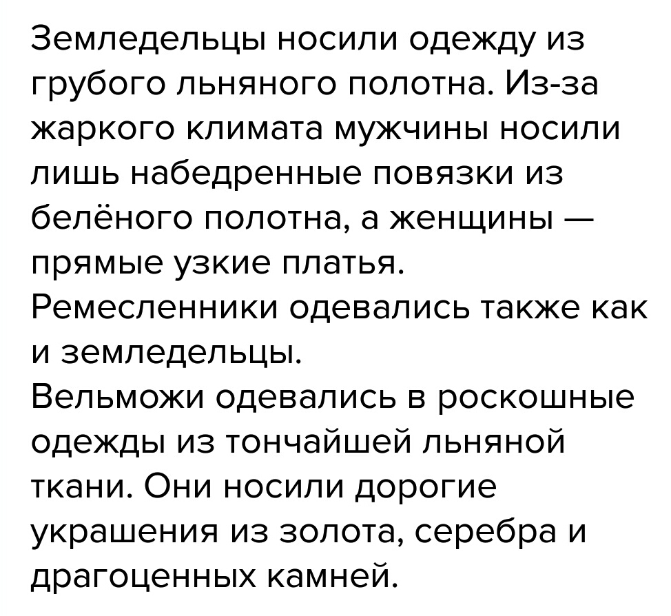 Земледельцы носили одежду из льняного полотна. Из-за жаркого климата мужчины носили лишь набедренные повязки из белёного полотна, а женщины — прямые узкие платья.