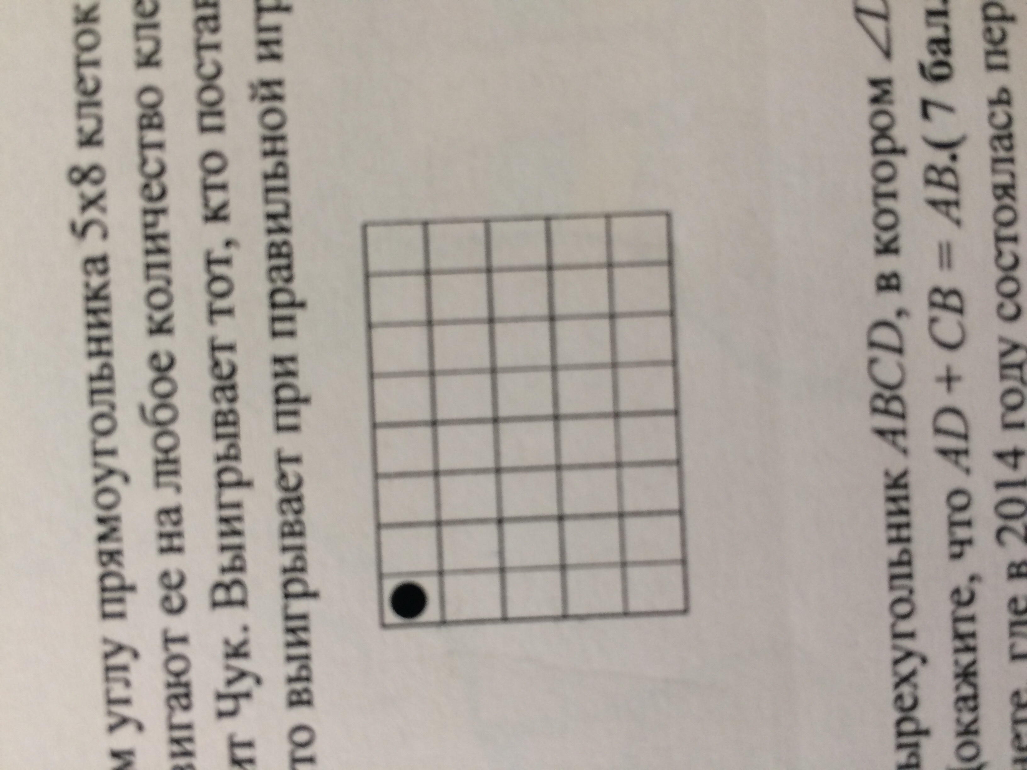 В левом верхнем углу прямоугольника 5 на 8 клеток лежит монета. Чук и Гек по очереди передвигают ее на любое количество клеток либо вправо, либо вниз. Первым ходит Чук. Выигрывает тот, кто поставит монету в правый нижний угол. Кто выиграет при правильной игре? Прошу, молю помогите, люди добрые и не очень.