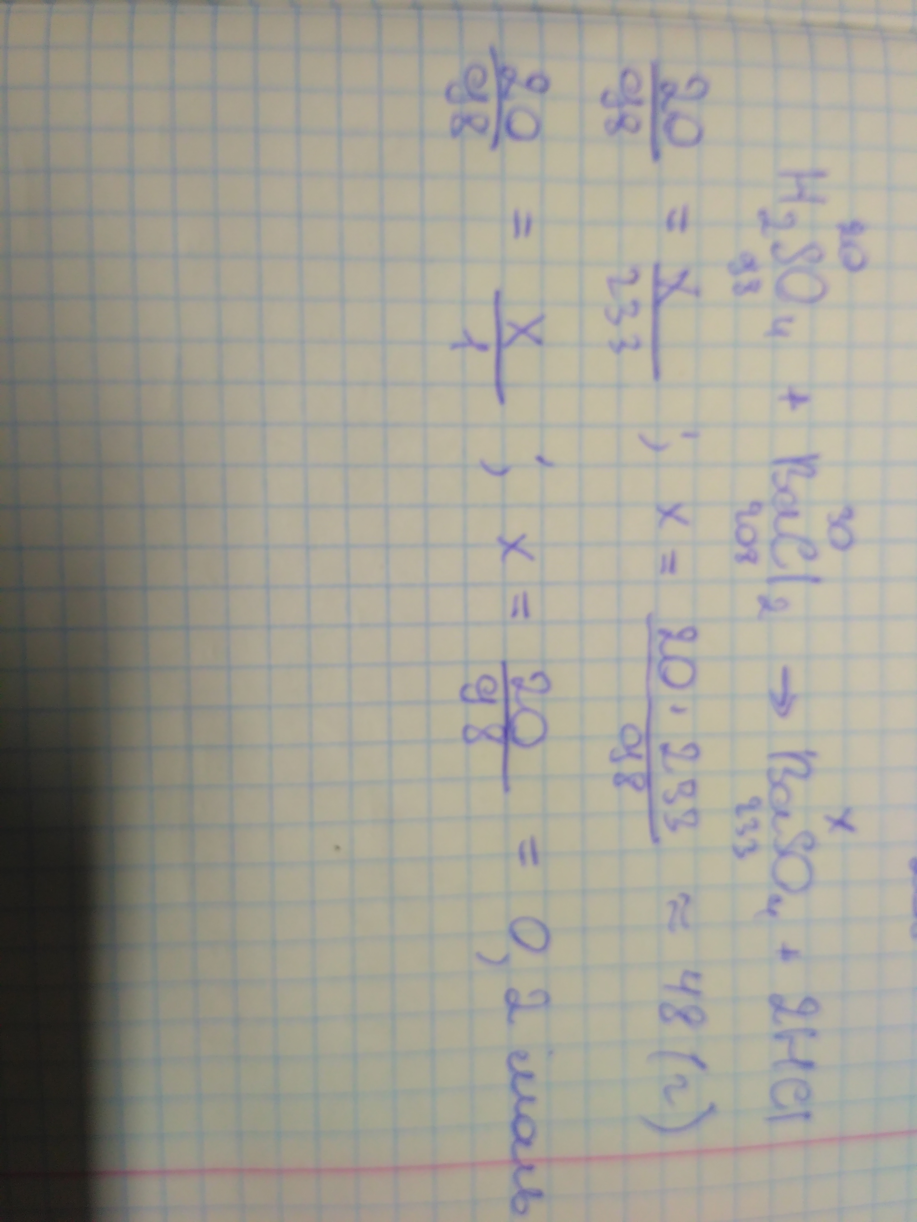 при взаимодействии 20 г серной кислоты с 30 граммами хлорида бария выпадает осадок Вычислите массу и количество вещества выпавшего остатка