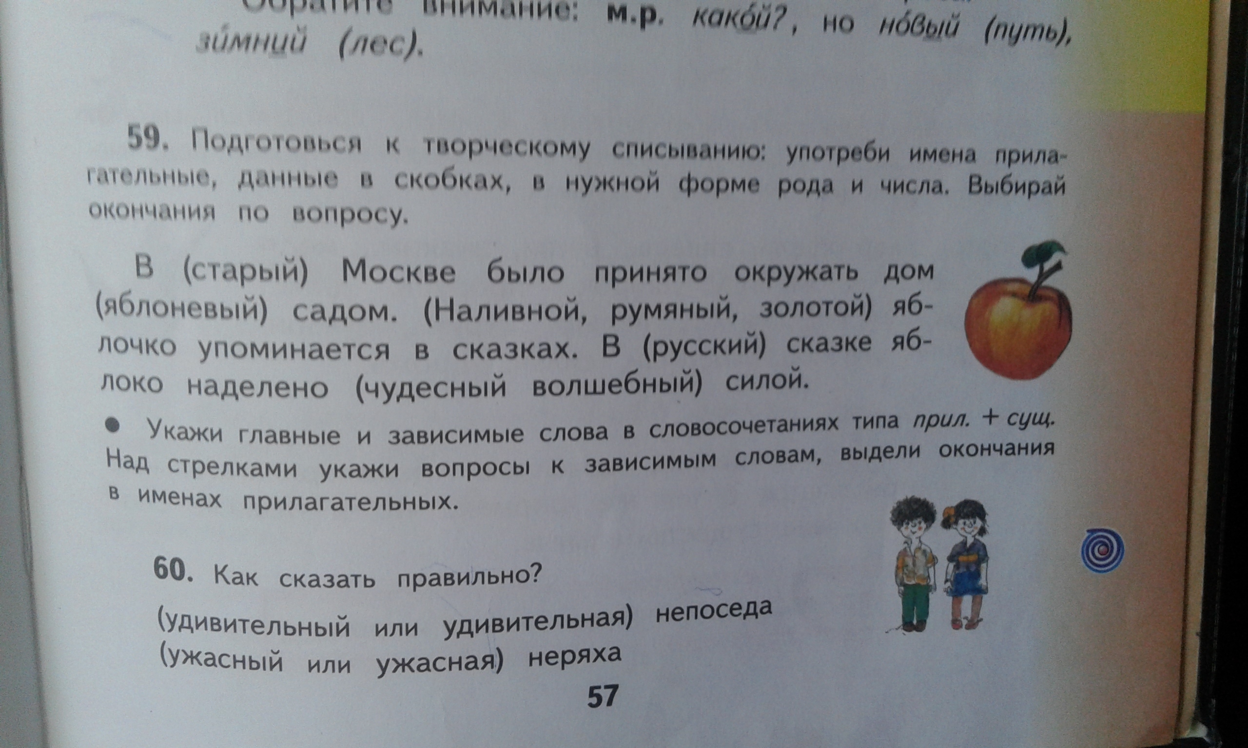 В старой Москве было принято окружать дом яблоневым садом.Наливное, румяное, золотое яблочко упоминается в русской сказке. Яблоко наделено чудесной, волшебной силой. В Москве(какой?) старОЙ, садом(каким?) яблоневЫМ, яблочко(какое?)наливнОЕ, румянОЕ, золотОЕ, сказке(какой?) русскОЙ, силой(какой?) чудеснОЙ, волшебнОЙ. Слова, от которых ставятся вопросы главные. Большими буквами выделены окончания прилагательных.