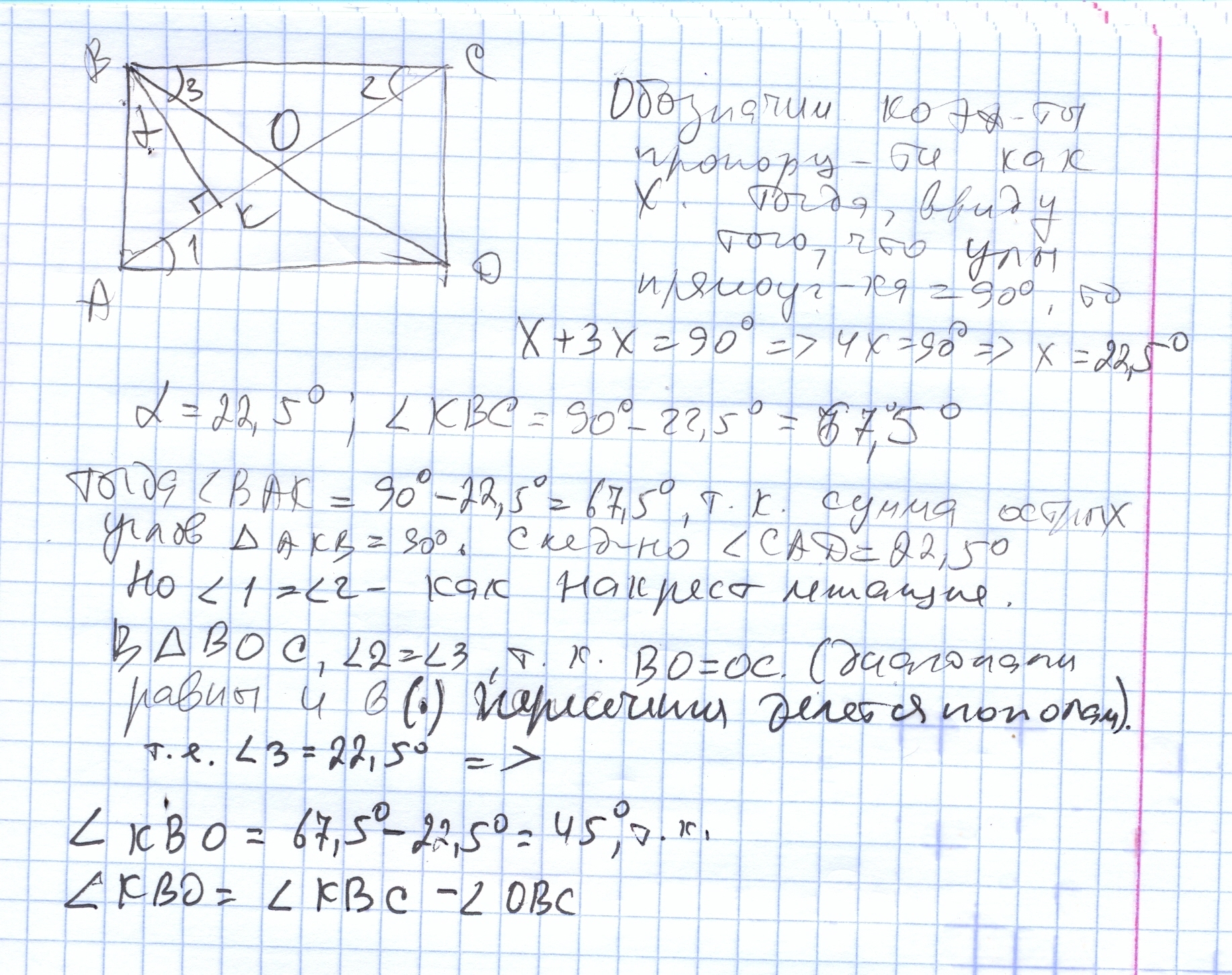 Из вершины прямоугольника ABCD на его диагональ опущена высота которая делит угол прямоугольника в отношении 3:1. Найдите угол между этим перпендикуляром и второй диагональю