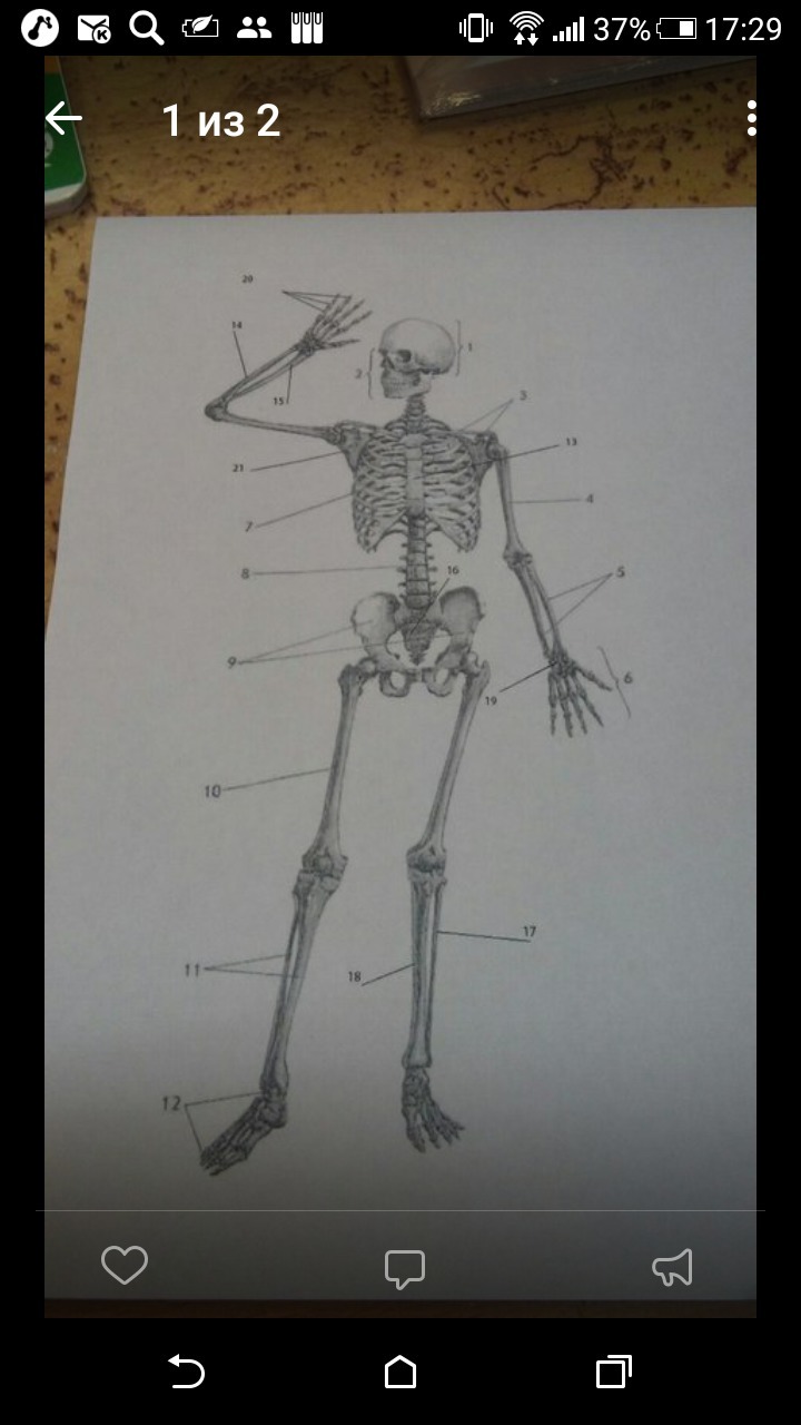 1) последовательность костей лучевая локтевая большая берцовая фаланги будет такая а) 15 14 18 20 б) 9 6 5 4 в ) 15 10 18 20 г) 1 2 21 10 2) номером 3 обозначено а) ребро б) череп в) запястье г) ключица 3) плечевая кость обозначена а) 11 б)2 в) 4 г) 10. 4) кости черепа обозначены а) 1 ,3 б) 5,6 в) 1,2,3 г) 1,2. 5) номером 8 обозначено а) ребро б) позвоночник в) ключица г) большая берцовая кость 6 ),при перелома необходимо а) иммобилизировать пореждёную конечность б) выложить фото в инстаграм в) вызвать врача г) ничего не делать 7) основной принцип иммобилизации а) обездвижить два соседних с местом перелома сустава б) привязать палочку в)дать пострадавшему обезболивающее г) обездвижить всю конечность 8 ) большая и малая берцовая кость а) 21 ,7 б) 17 ,18 в)18,17 г) таких костей нет 9 ) номером 13 обозначено а) грузина б) череп в) ребро г) позвоночник