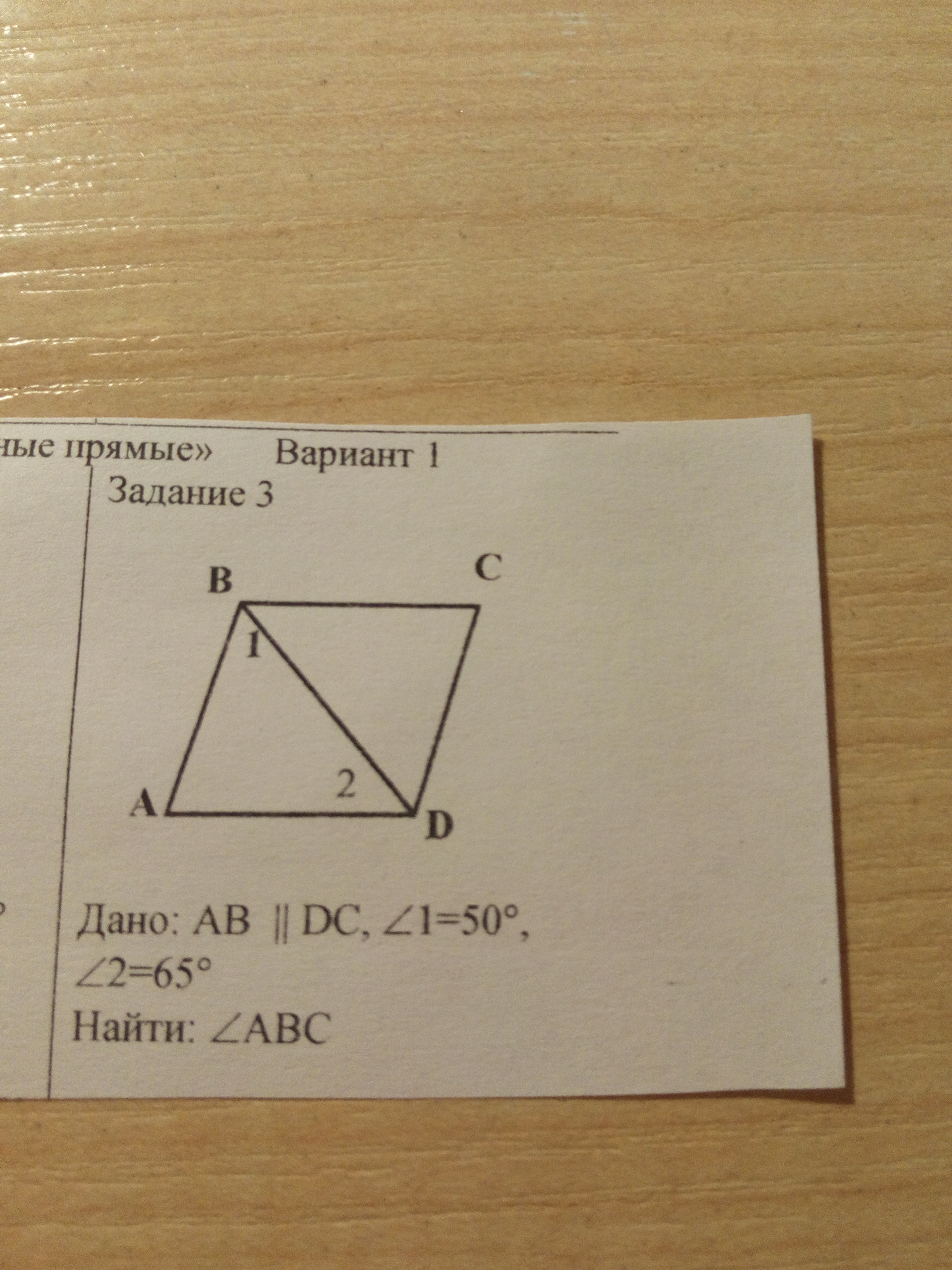 Угол СВД равен углу АДВ как накрест лежащий (= 65 градусов), а угол АВС тогда равен 50+65 = 115 градусов