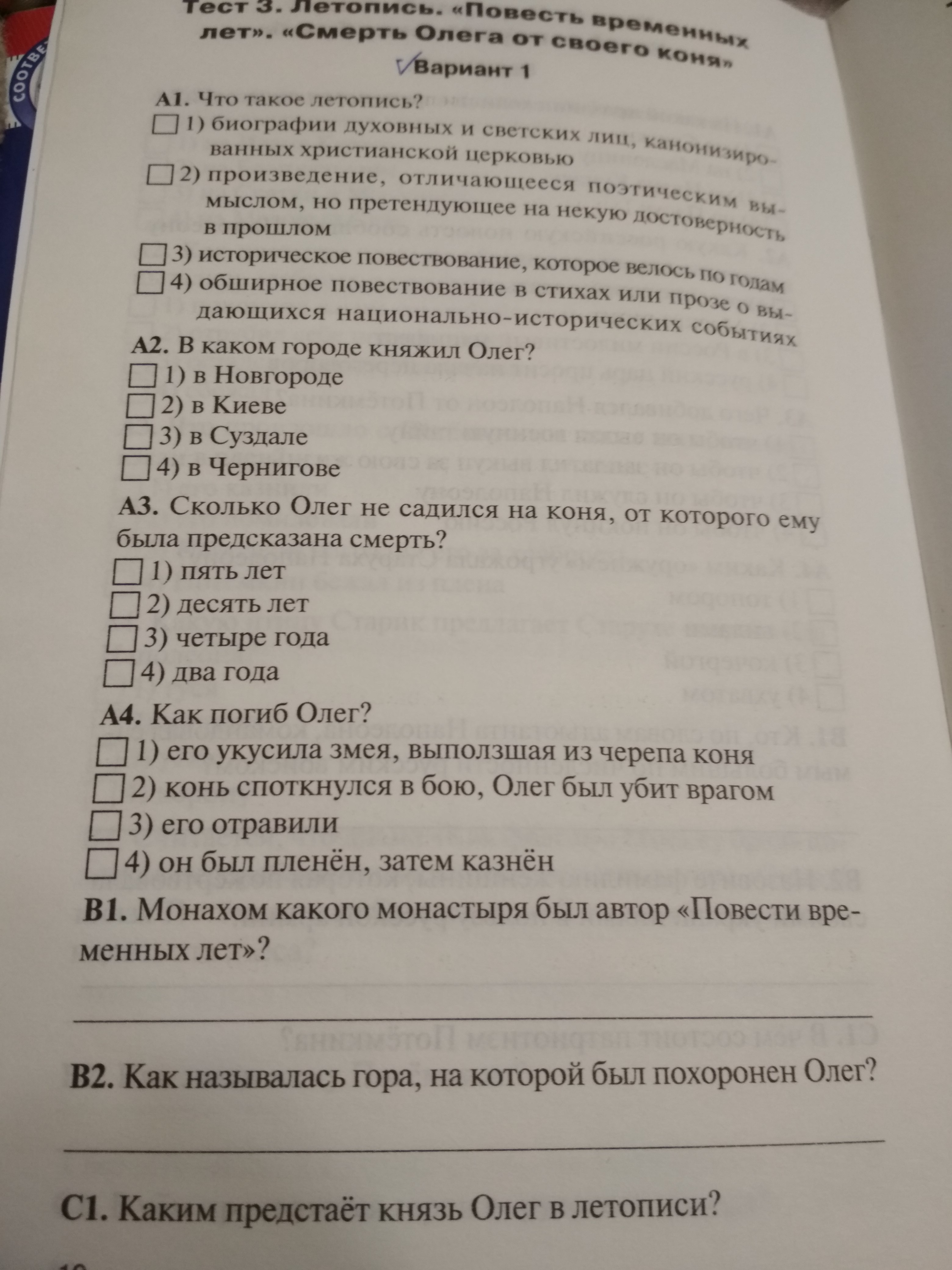 а1-3, а2-2, а3-3, а4-1, в1- Киево-Печерского монастыря, в2- Щекавица, с1- мудрым, умеющим предсказывать будущее, умным, бесстрашным и находчивым