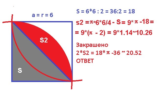 Закрашенная часть - это два участка составляющих разность между четвертью круга и половиной квадрата.